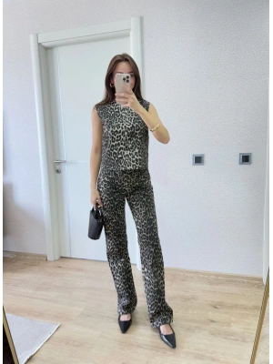 leopar desenli Düğmeli Bluzlu Pantolon İkili Takım -Leopar
