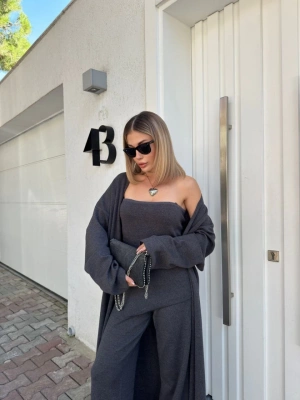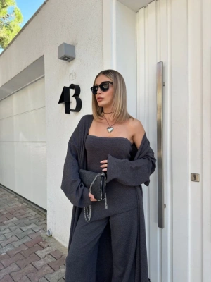 Uzun Kollu Önü İp Büzgülü Crop ve Pantolon İkili Takım - Antrasit