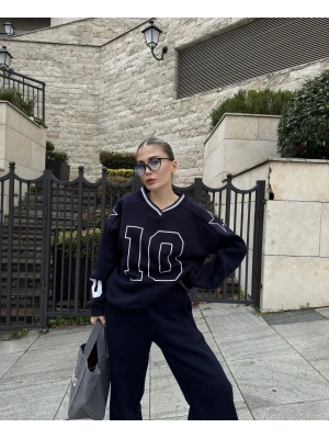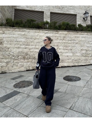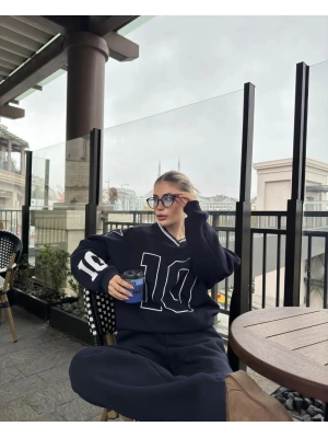 iki iplik Kapüşonlu Fermuarlı Crop Oversize Hırka Takım - Lacivert