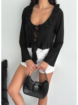 Keten Uzun Kol Bağacık Detaylı Bluz - Siyah