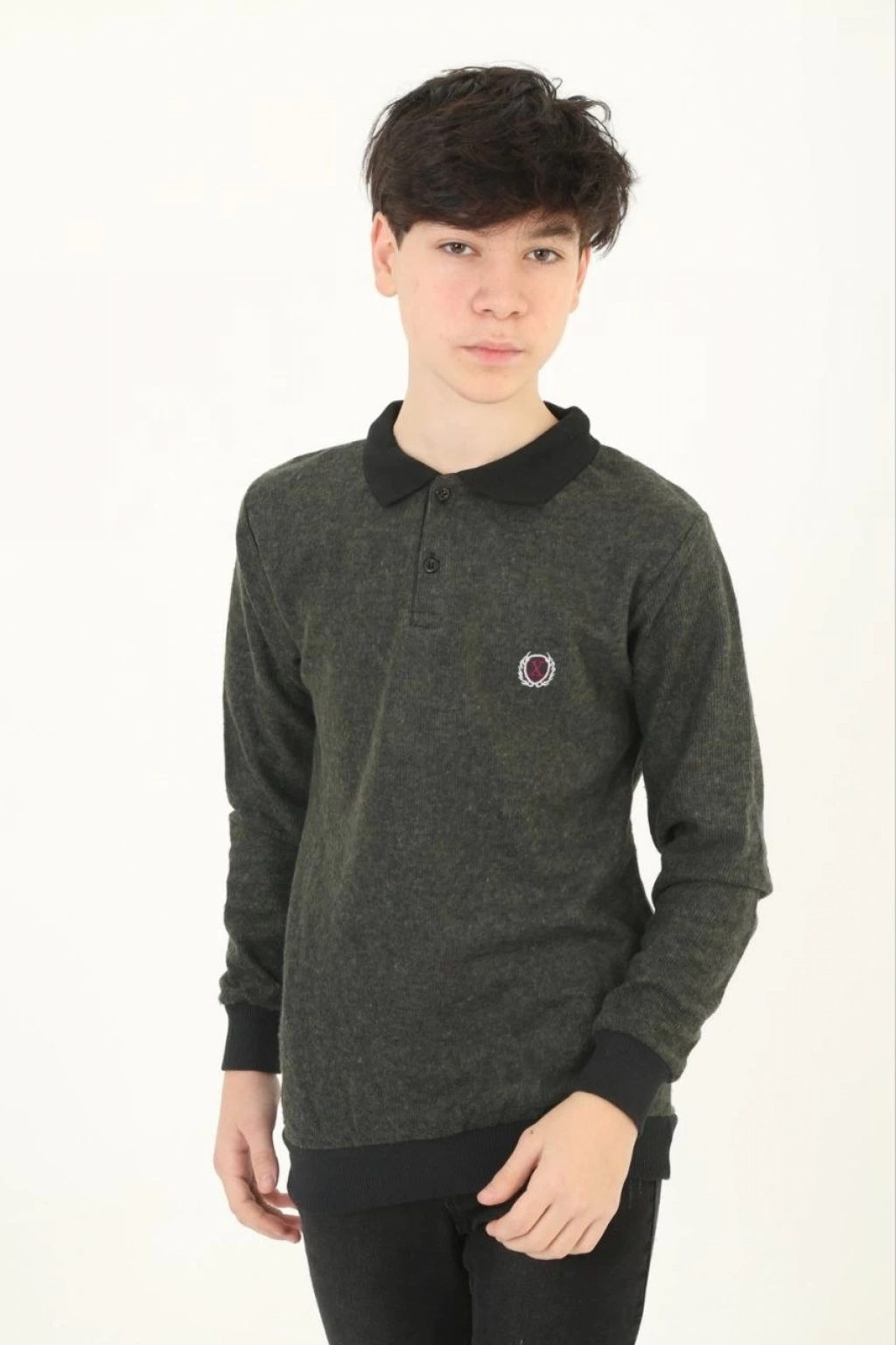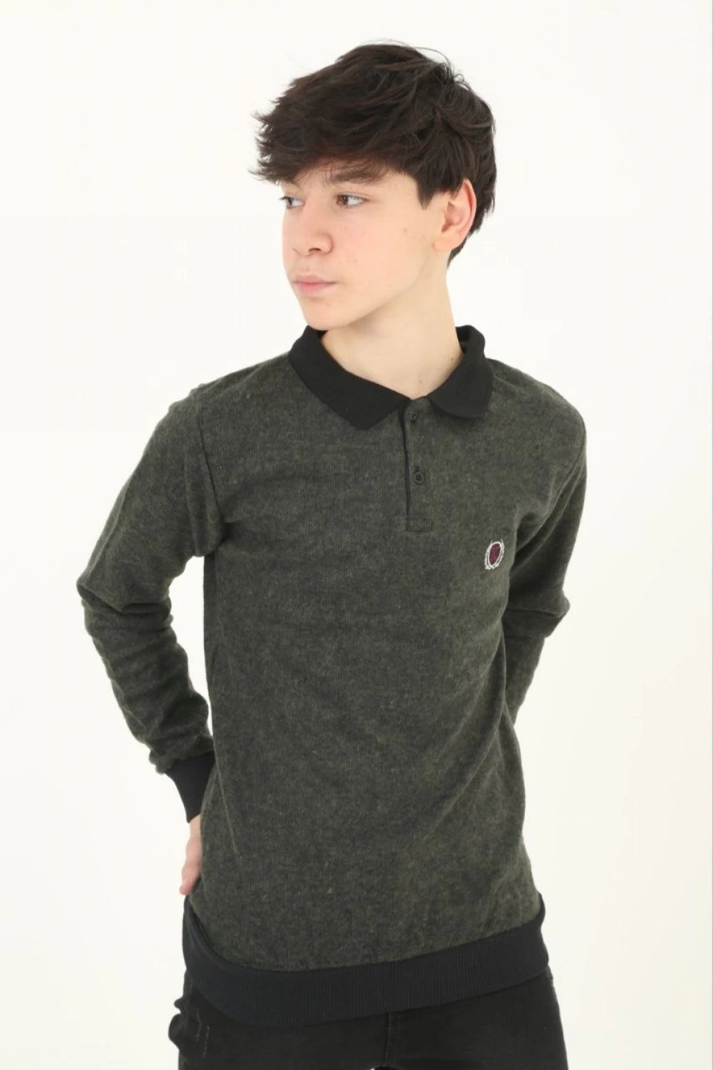 • Çocuk Selanik Yaka Nakışlı Kazak - Haki