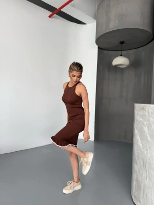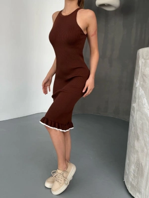 Fırfır Detaylı Triko Elbise- Kahverengi