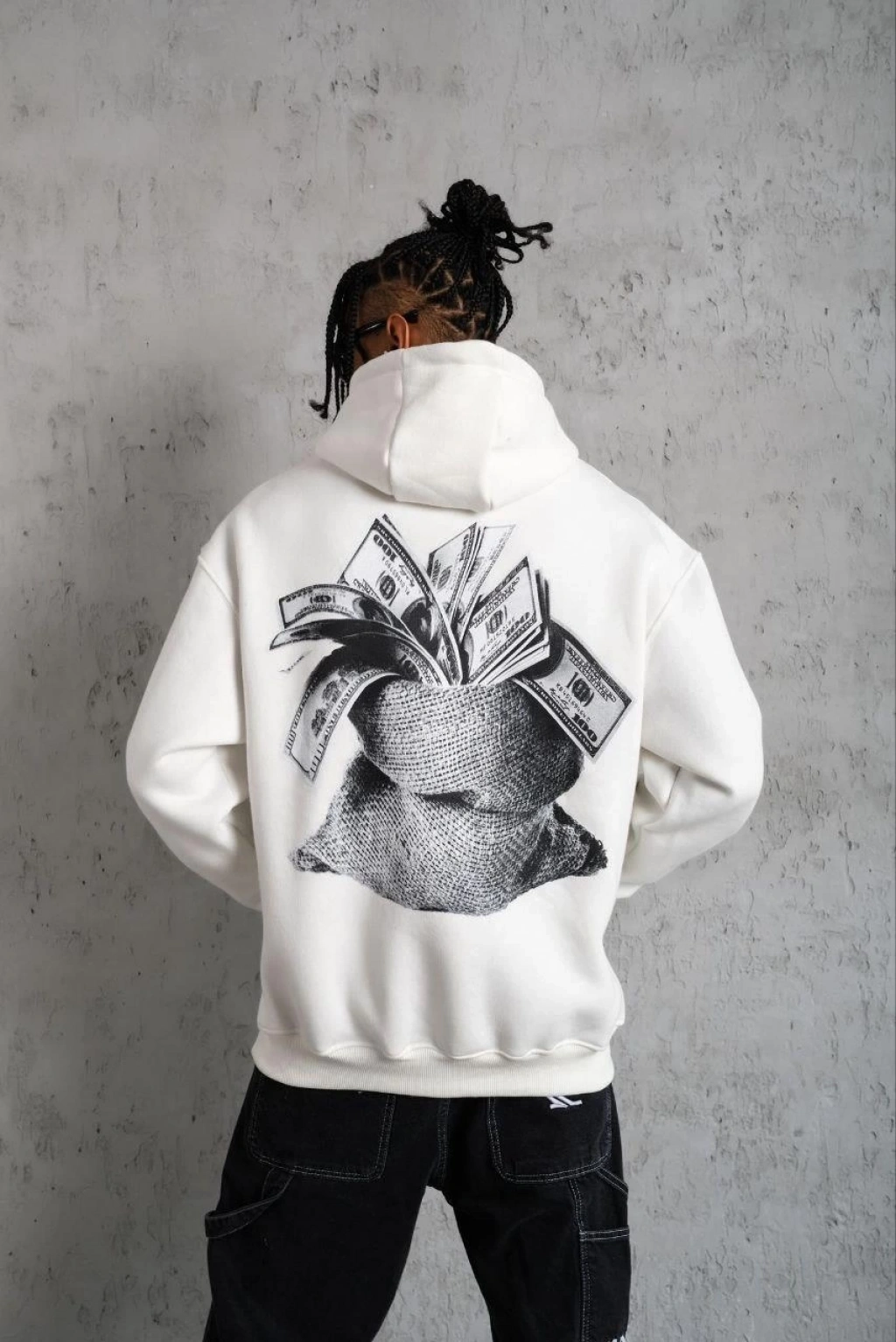 • Erkek Kanguru Cep Baskılı Kapüşonlu Sweatshirt - Beyaz