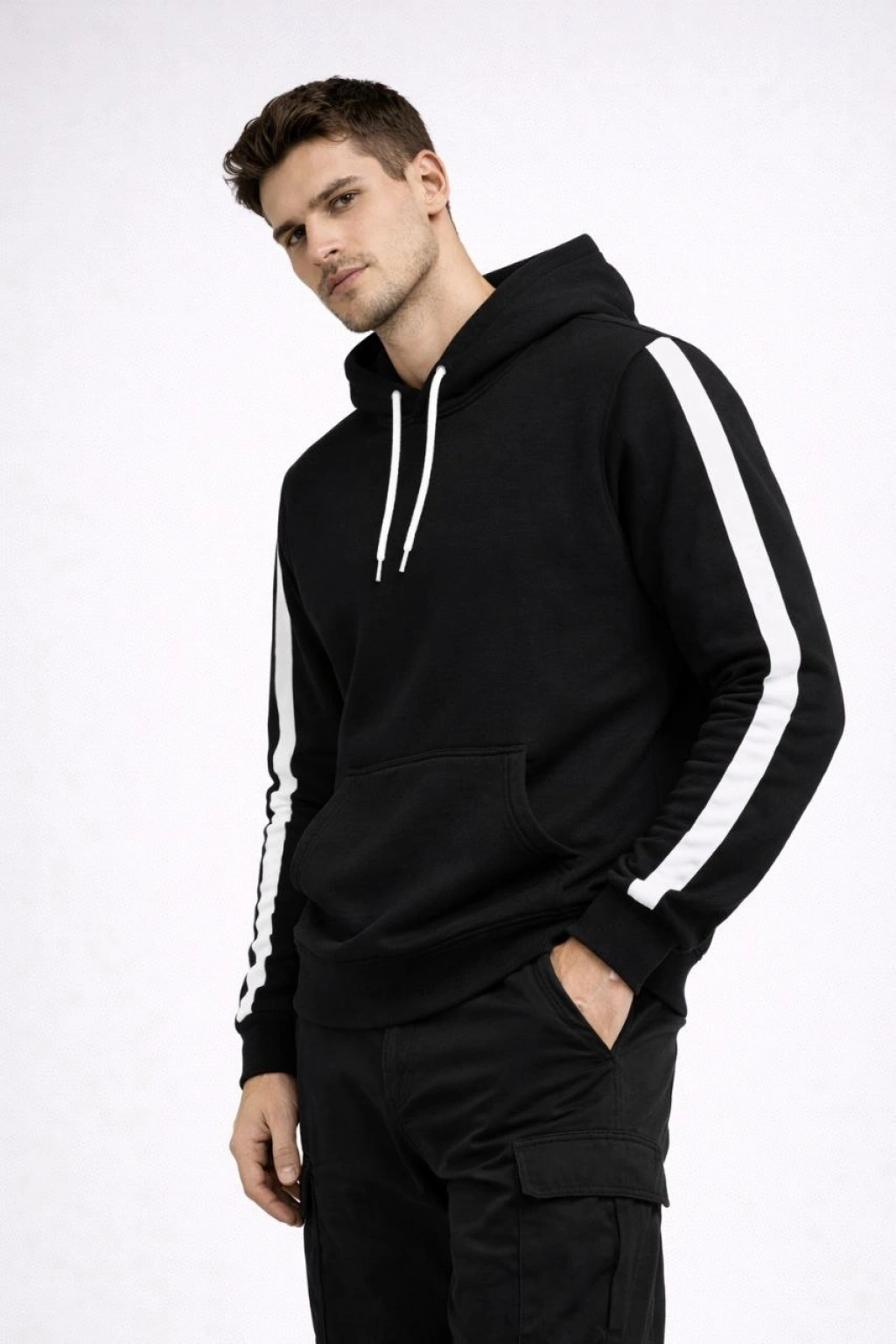 Erkek Şeritli Kapüşonlu Sweatshirt Oversize 3 iplik Pamuklu - Siyah