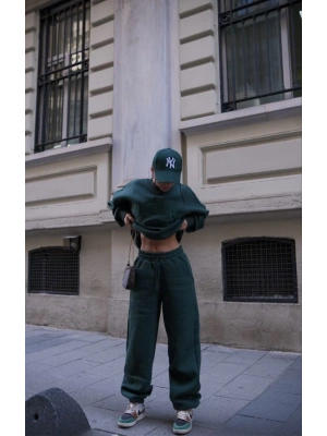 Bisiklet Yaka Nakış İşlemeli Üç İplik Sweat Takım - Yeşil