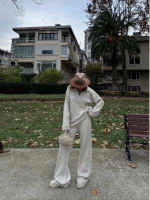 Yakalı Cizgi Detaylı Triko İkili Takım - Beyaz