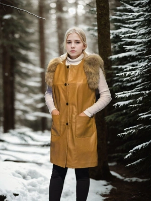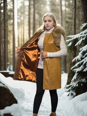 Kadın Kolsuz Hakiki Deri Kürk - Hardal