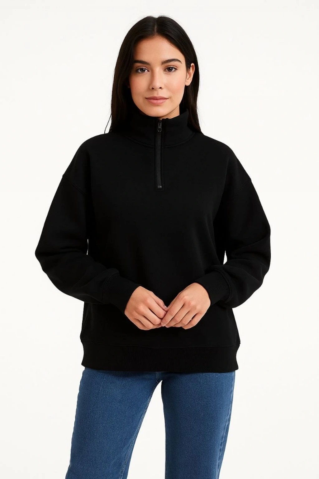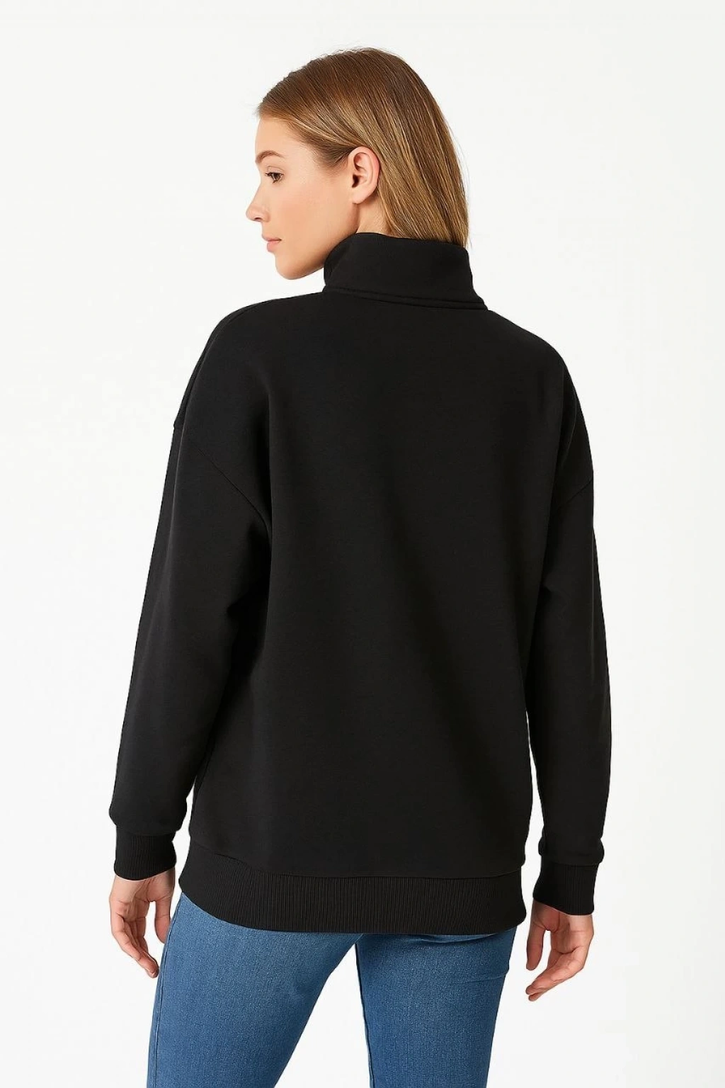 Kadın Üç İplik Dık Yaka Yarım Fermuarlı SweatShirt - Siyah