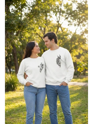 Sevgililer Günü Özel Bisiklet Yaka Aslan Baskılı Oversize Sweatshirt - Beyaz