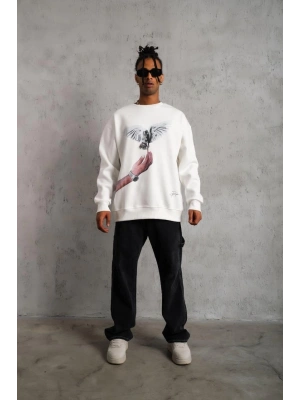 Erkek Güvercin Baskılı Sweatshirt - Beyaz