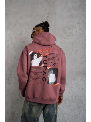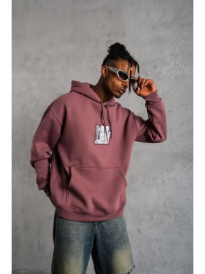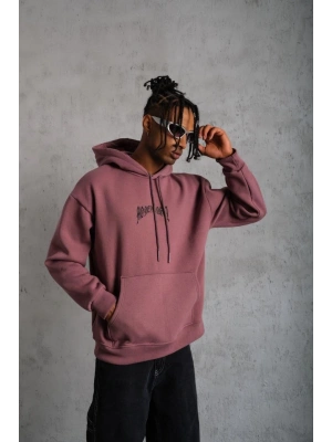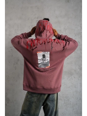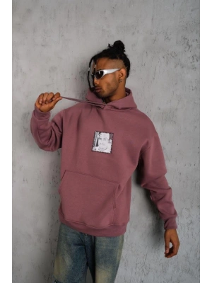 Erkek Ön ve Arka Baskılı Kapüşonlu 3 İplik Sweatshirt - Gül Kurusu