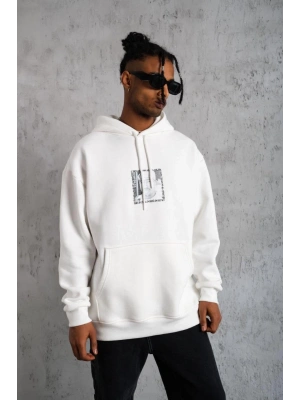 Erkek Baskılı Üç İplik Kapüşonlu Oversize Sweatshirt - Beyaz