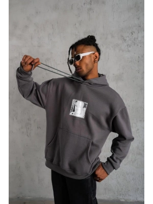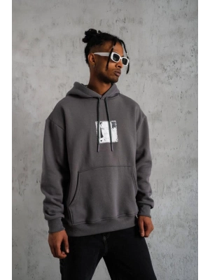 Erkek Baskılı Kapşonlu Sweat - Füme