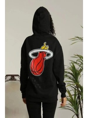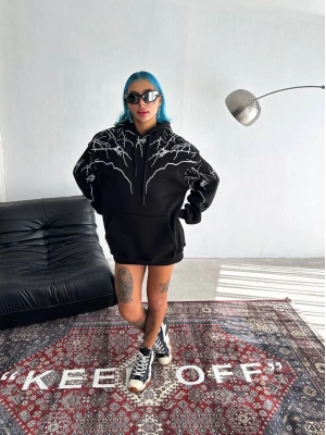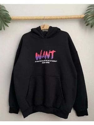 Kadın Sırt Baskılı Kapüşonlu Üç İplik Oversize Sweatshirt - Siyah