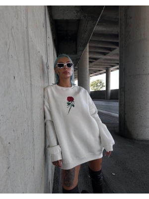 Bisiklet Yaka Üç İplik Baskılı Oversize SweatShirt - Beyaz