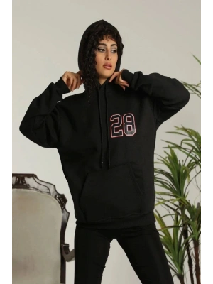 Üç İplik Penye Uzun Kol Kapşonlu Baskılı SweatShirt - Siyah