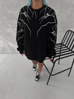 Kadın Yıldırım Baskılı Bisiklet Yaka SweatShirt - Siyah