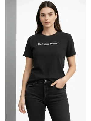 Kadın Wafıl Kumaş Tişört Regular Kalıp Bisiklet Yaka Baskılı Günlük Basic T-Shirt - Siyah