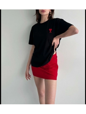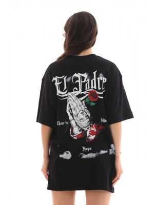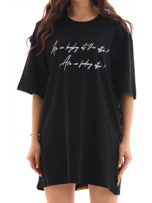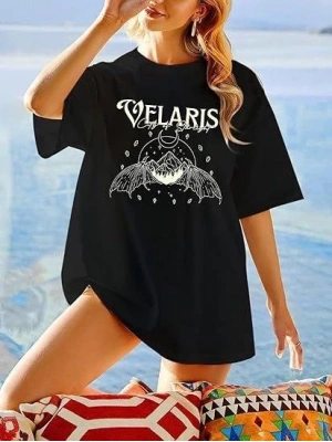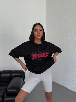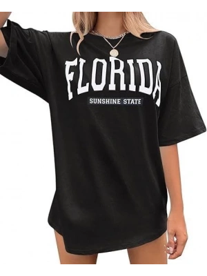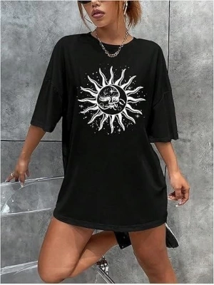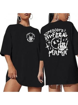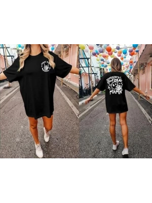 kadın Bisiklet Yaka Baskılı Oversize T-Shirt - Siyah