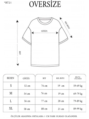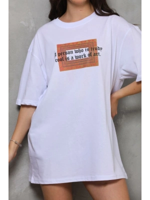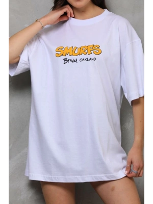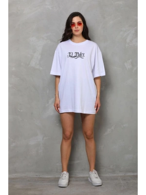 kadın Bisiklet Yaka Baskılı Oversize T-Shirt - Beyaz