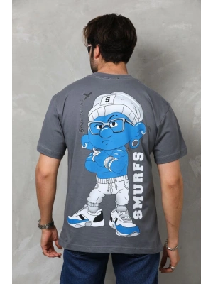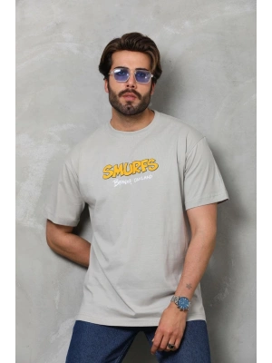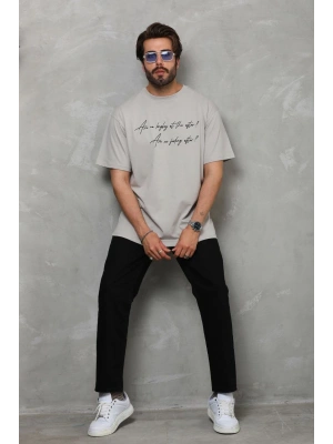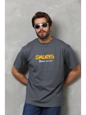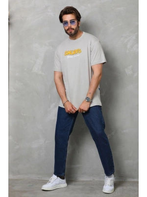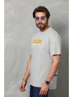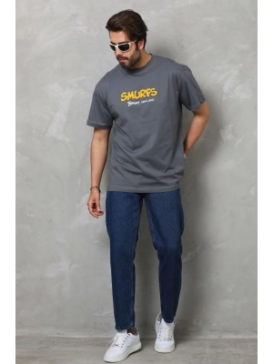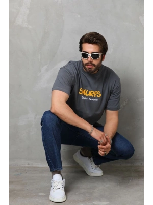 Erkek Bisiklet Yaka Baskılı Oversize T-Shirt - Füme