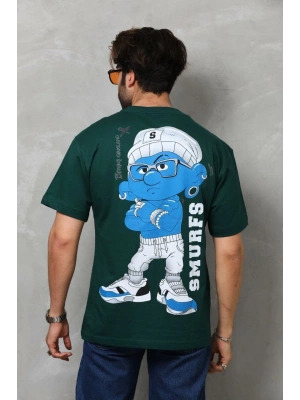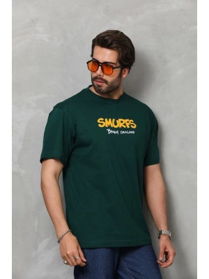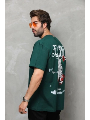 Erkek Bisiklet Yaka Baskılı Oversize T-Shirt - Yeşil