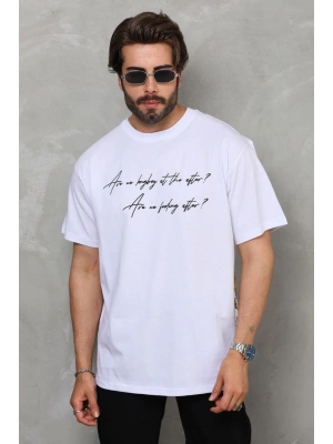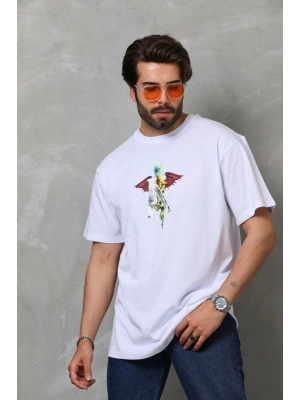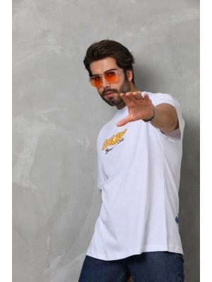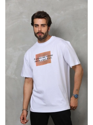 Erkek Bisiklet Yaka Baskılı Oversize T-Shirt - Beyaz