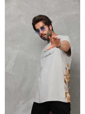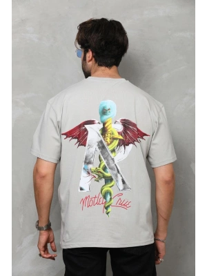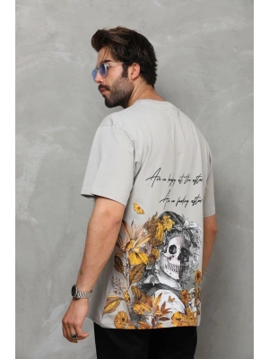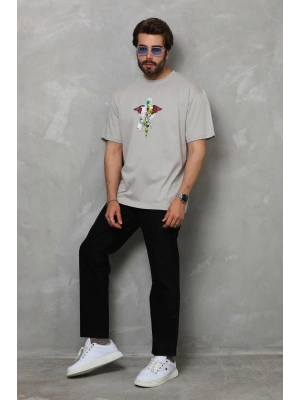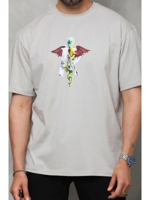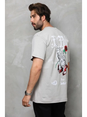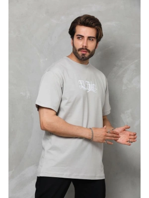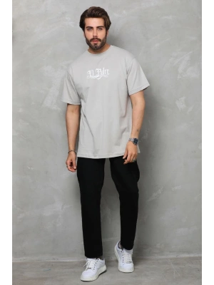 Erkek Bisiklet Yaka Baskılı Oversize T-Shirt - Gri