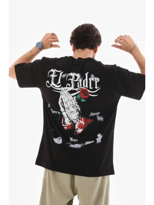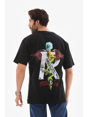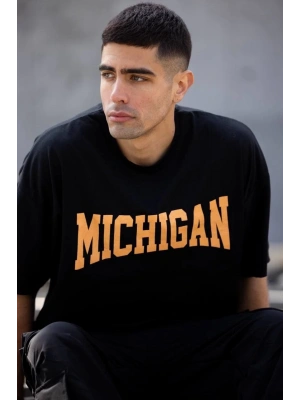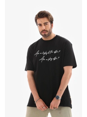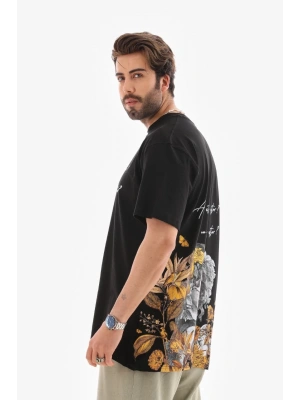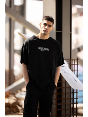 Erkek Bisiklet Yaka Baskılı Oversize T-Shirt - Siyah