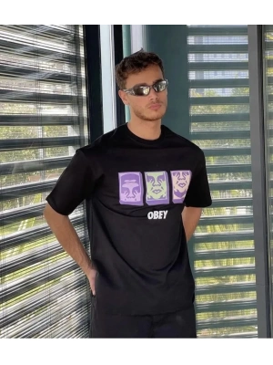Erkek Bisiklet Yaka Baskılı Oversize T-Shirt - Siyah
