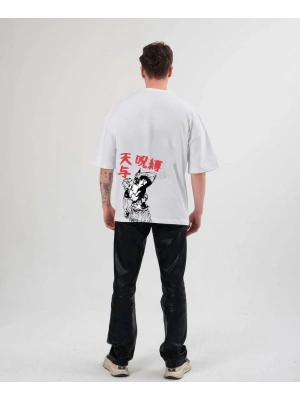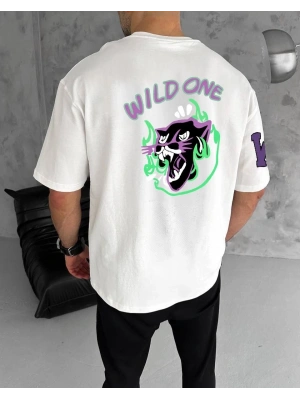 ERKEK Bisiklet Yaka ön ve sırt Baskılı Oversize T-Shirt - Beyaz
