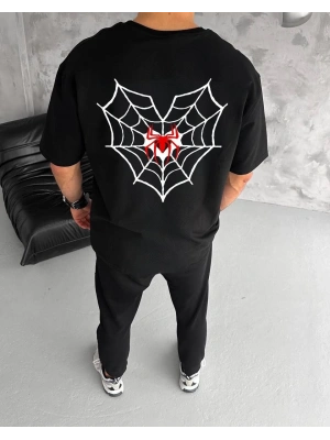 ERKEK Bisiklet Yaka ön ve sırt örümcek Baskılı Oversize T-Shirt - Siyah