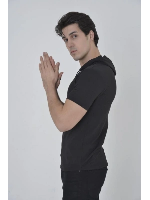 Erkek Kapşonlu Slim Fit T-shirt - Siyah