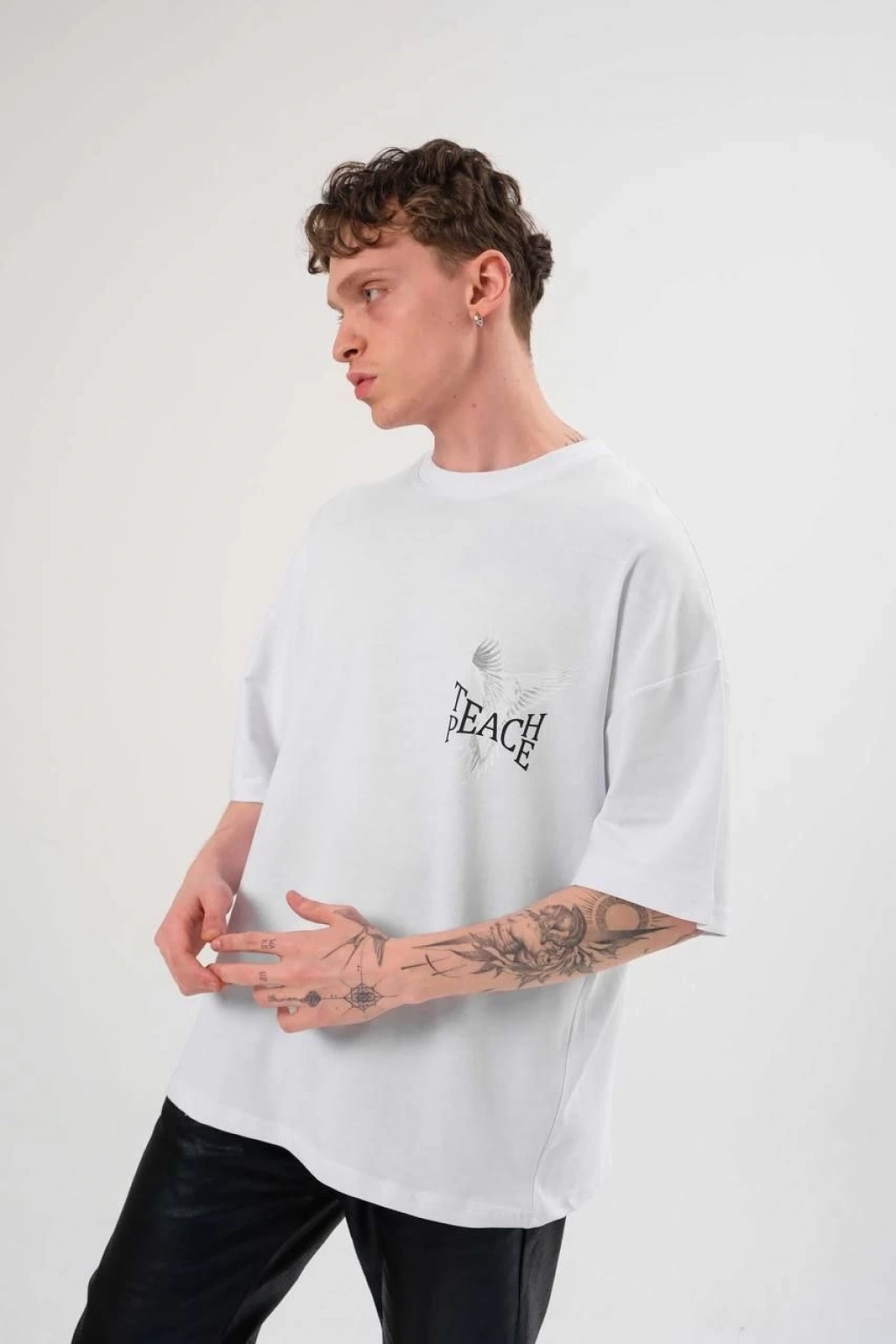 Erkek Bisiklet Yaka Baskılı Oversize T-Shirt - Beyaz