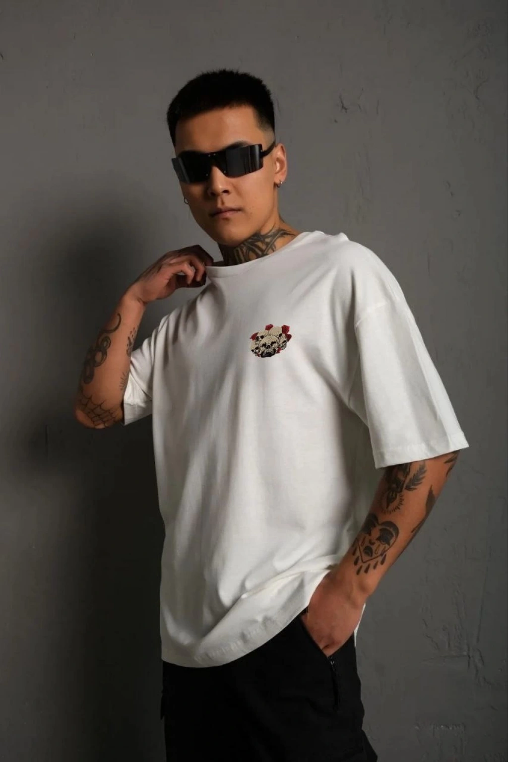 • Erkek Bisiklet Yaka Baskılı Oversize T-Shirt - Beyaz