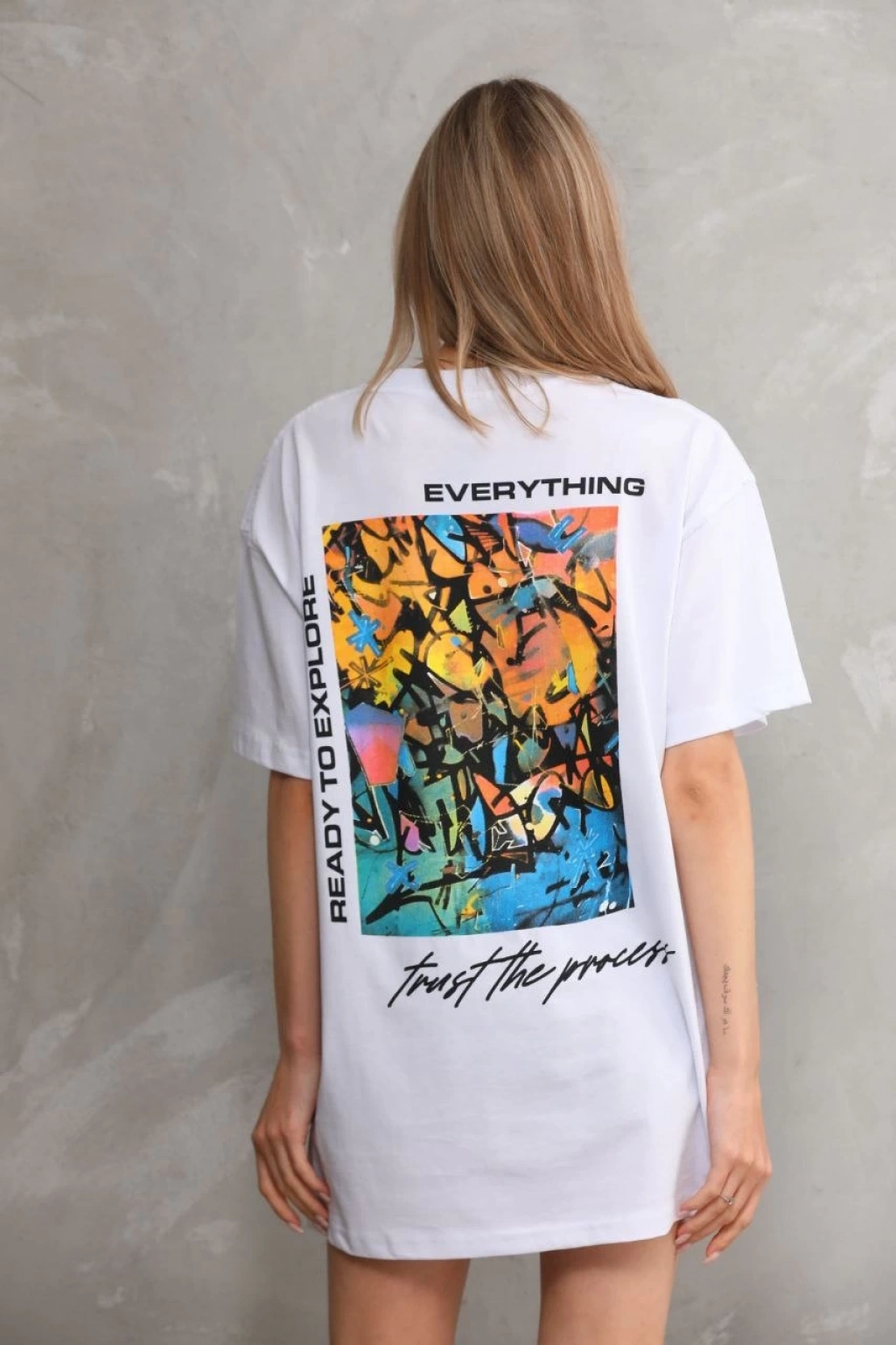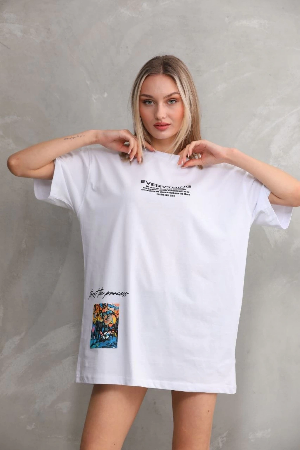 kadın Bisiklet Yaka Baskılı Oversize T-Shirt - Beyaz