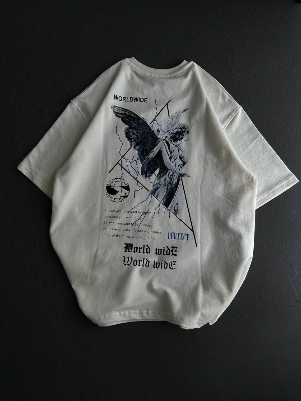 kadın Bisiklet Yaka Baskılı Oversize T-Shirt - Beyaz