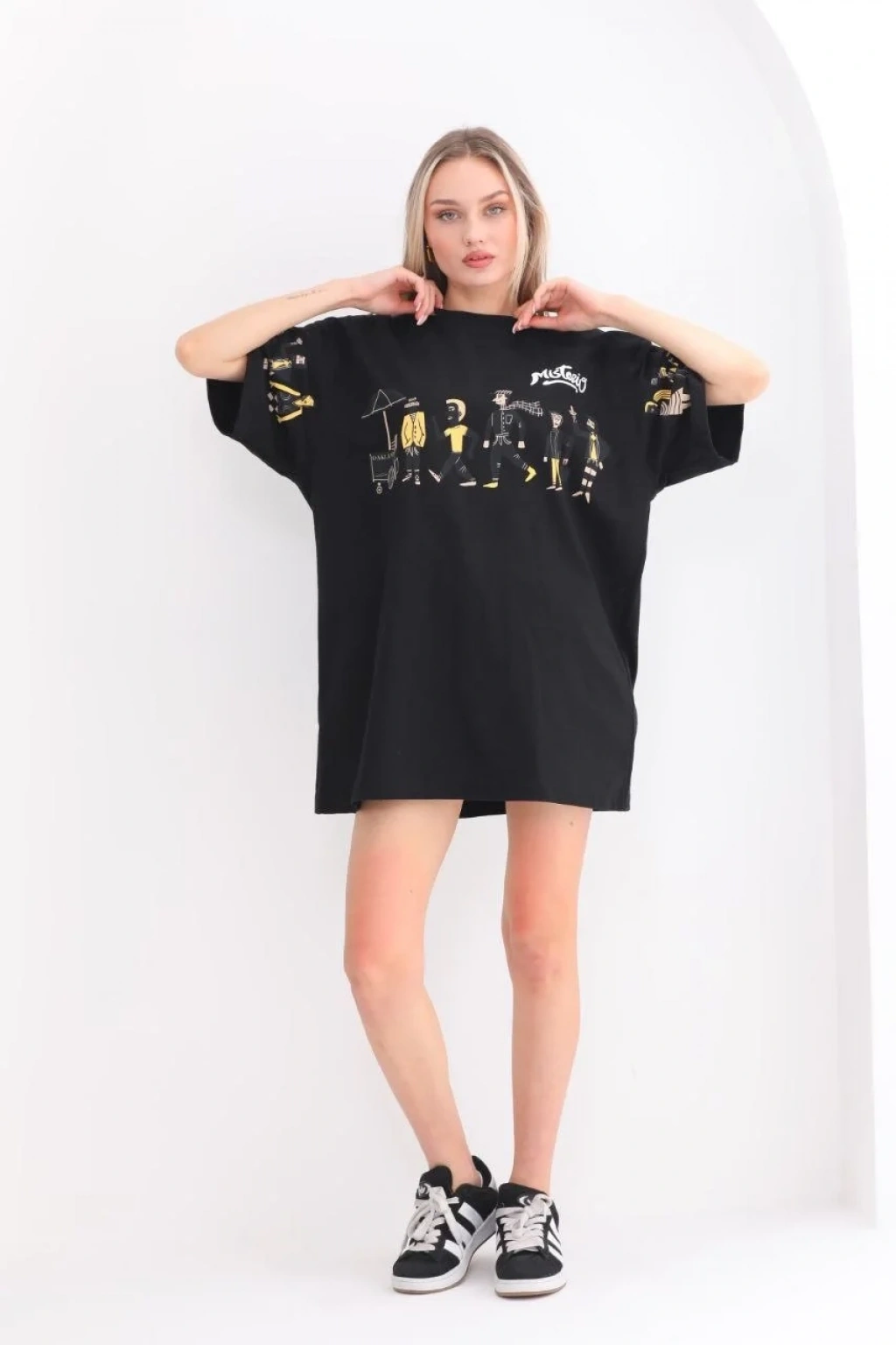 kadın Bisiklet Yaka Baskılı Oversize T-Shirt - Siyah