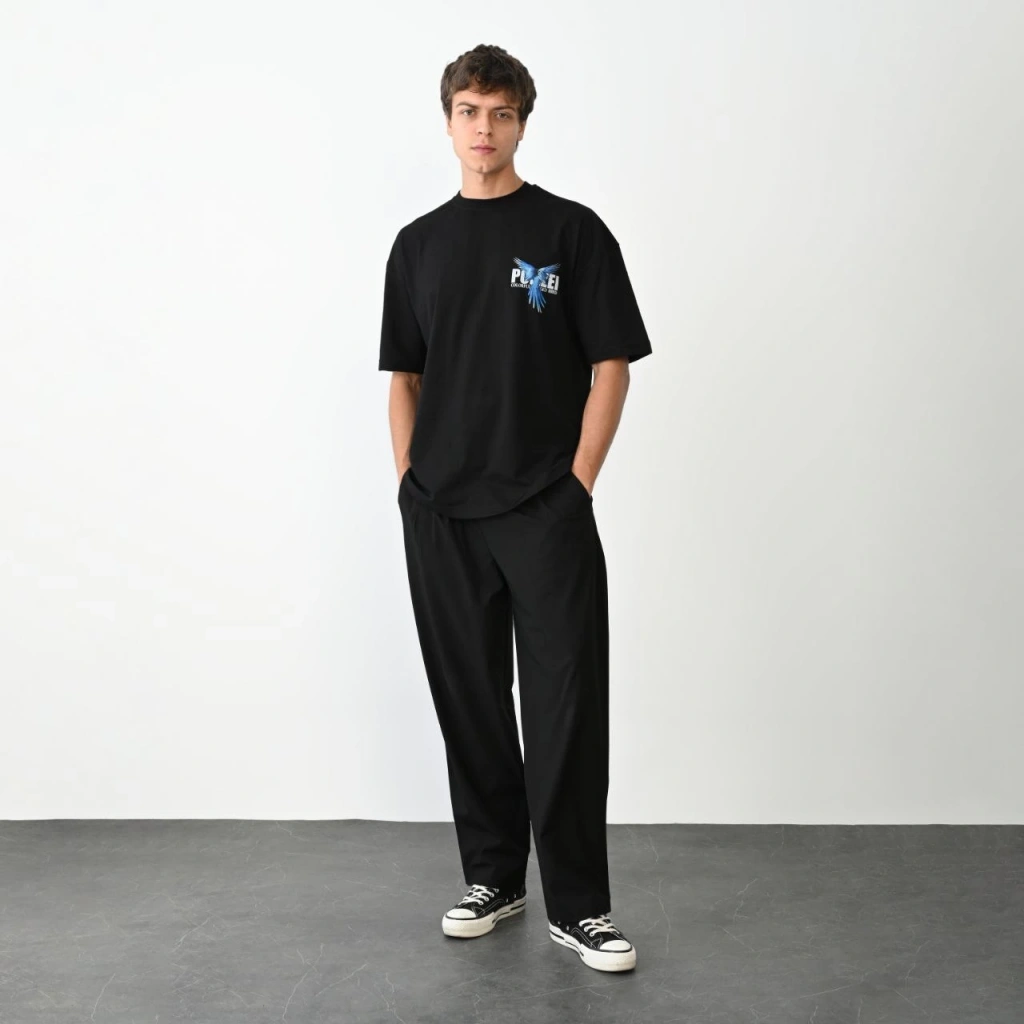ERKEK Bisiklet Yaka Baskılı Oversize T-Shirt - Siyah