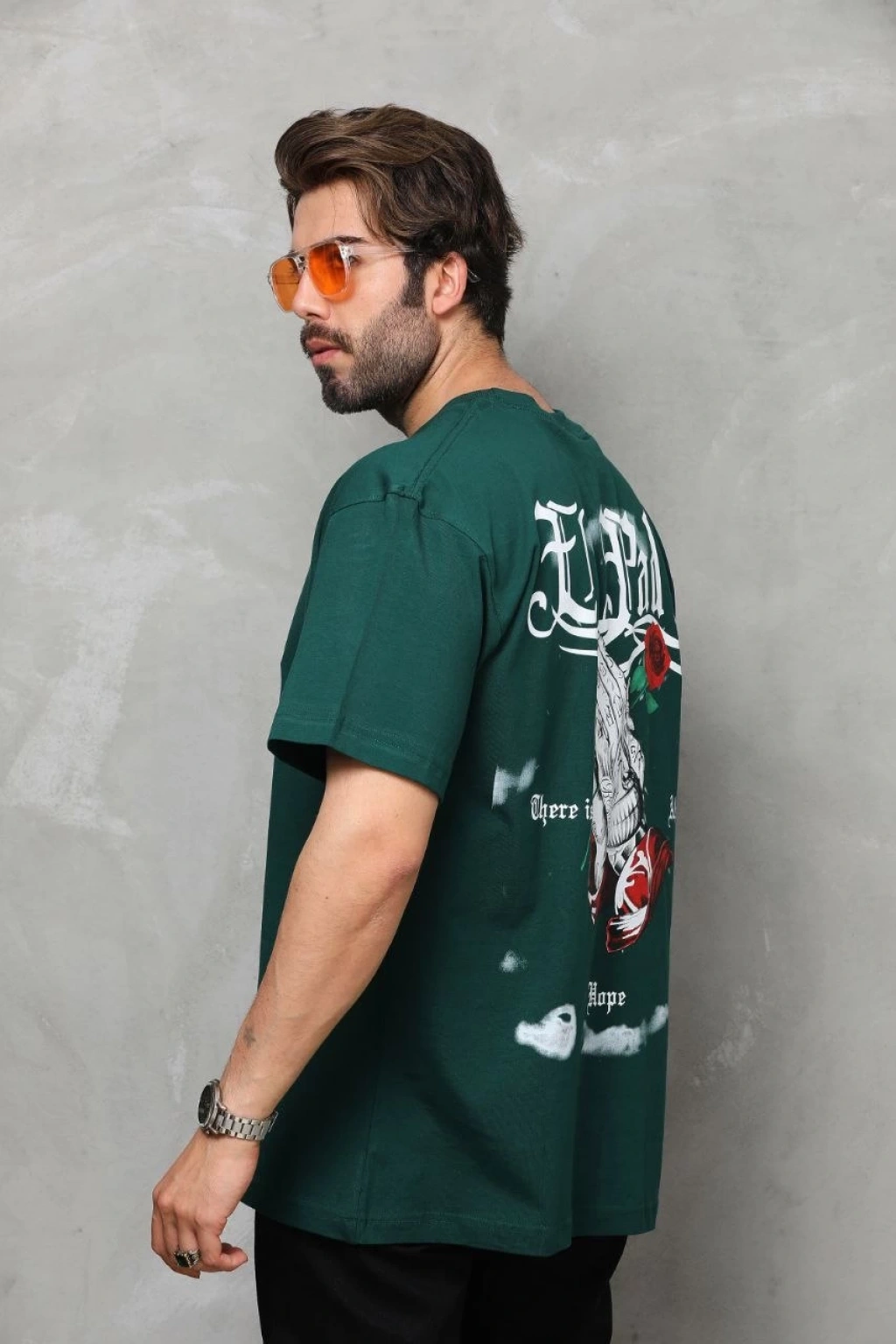 Erkek Bisiklet Yaka Baskılı Oversize T-Shirt - Yeşil