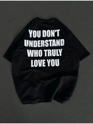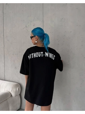 Kadın Bisiklet Yaka Baskılı Oversize T-Shirt - Siyah