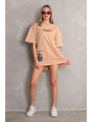 kadın Bisiklet Yaka Baskılı Oversize T-Shirt - Bej