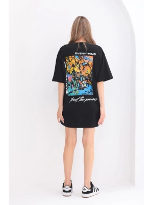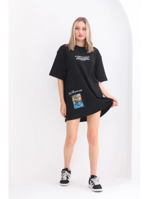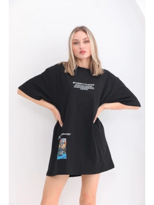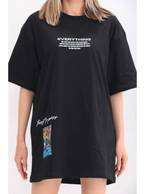 kadın Bisiklet Yaka Baskılı Oversize T-Shirt - Siyah