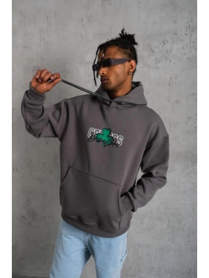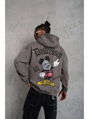 Erkek Baskılı Kapüşonlu Ribanalı Sweat - Gri