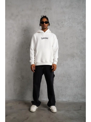 Erkek Kol ve Etek Ribana Baskılı Kapüşonlu Sweat - Beyaz