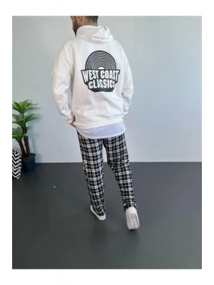 Erkek Sırt Baskılı Oversize Üç İplik Kapüşonlu Sweatshirt - Beyaz