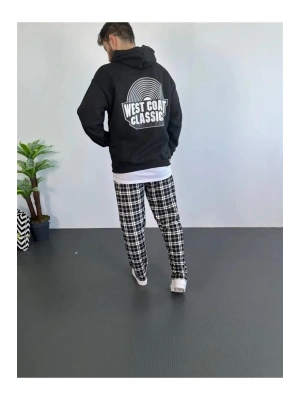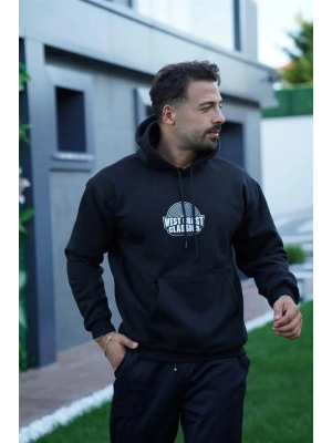 Erkek Sırt Baskılı Oversize Üç İplik Kapüşonlu Hoodie Sweatshirt - Siyah